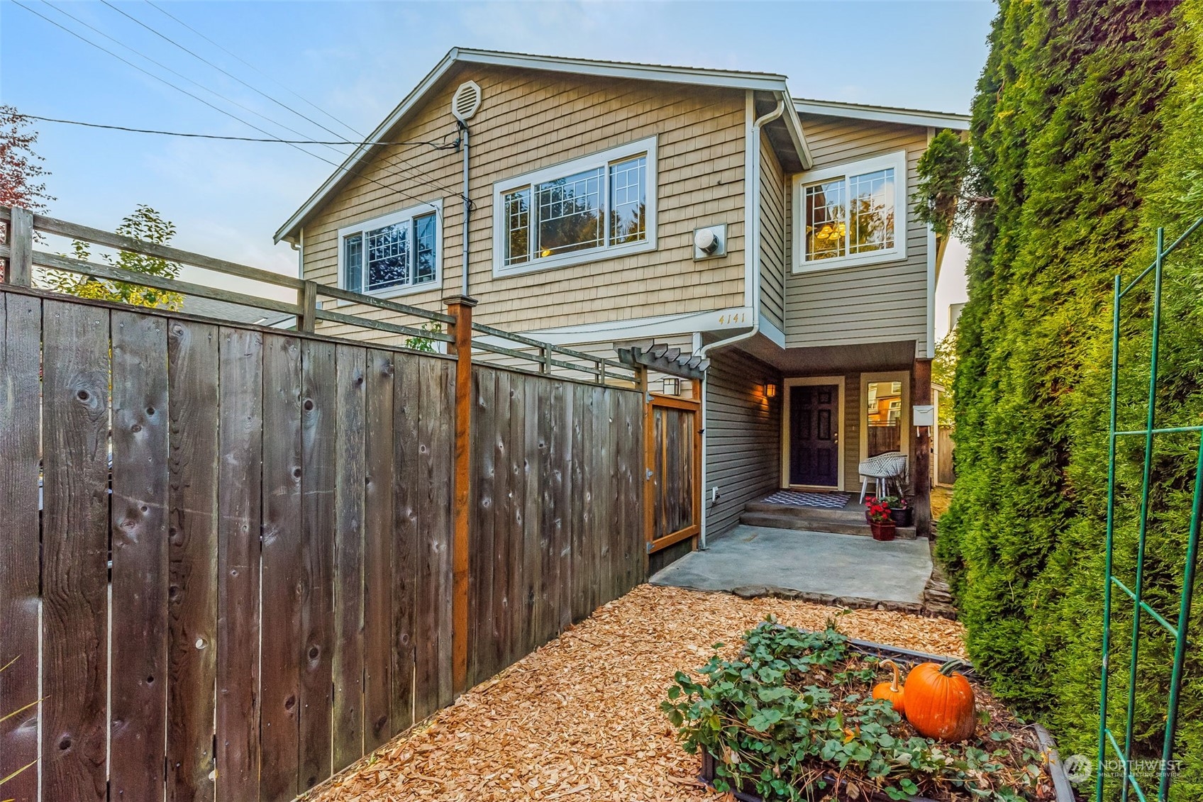 Convenient location, 2-Story, duplex style townhouse thoughtfully designed for indoor & outdoor living. Main features nice entry, 2 good-sized bedrms, bath, W/D, storage. Bedrm w/ slider to backyard = great home office! Head upstairs to great room featuring gas fireplace, vaulted ceilings, dining, galley kitchen w/ skylight, good counter space & nice view from sink. Big Primary Bedroom Suite on west end offers 2 lg. closets & full bath w/ 2-sink vanity + skylight. All outdoor spaces fully fenced. In front are 2 raised-bed gardens, courtyard & lg covered porch. Back yard has small patio, established perennials & nice tree. Single car garage & lg driveway. 2-minute walk to bus stops & quick trips to DT and all West Seattle offers. No HOA dues