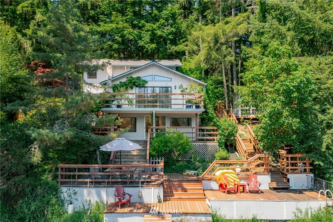 Unique 3 level, 1700 sq. ft., 2 bedroom, 2 bath home with 128’ of waterfront. Recently remodeled baths, custom etched glass throughout. Wrap around multi-level decks and covered area for winter BBQs. Stunning garden shed/green house, shop and double carport all with vintage windows. This double lot offers a private, park like setting with amazing views of the lake and two nearby islands. This remodel was built before the current 100’ setback restrictions, so it is closer to the water than new construction. Don’t just buy a house, buy a lifestyle.